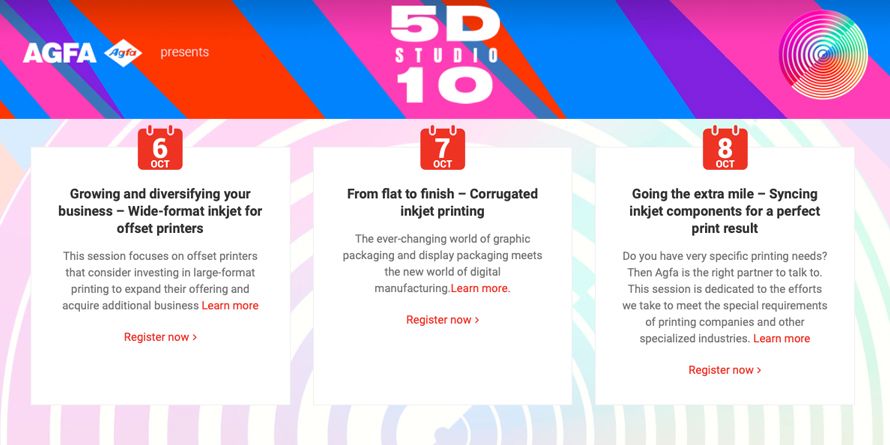 Agfa has announced Studio 5D10, a three-day virtual event featuring broadcast sessions focused on inkjet printing in order to support printing companies worldwide through their current business challenges and help them thrive in the future. The event will run from 6 to 8 October, coinciding with the rescheduled FESPA time frame.